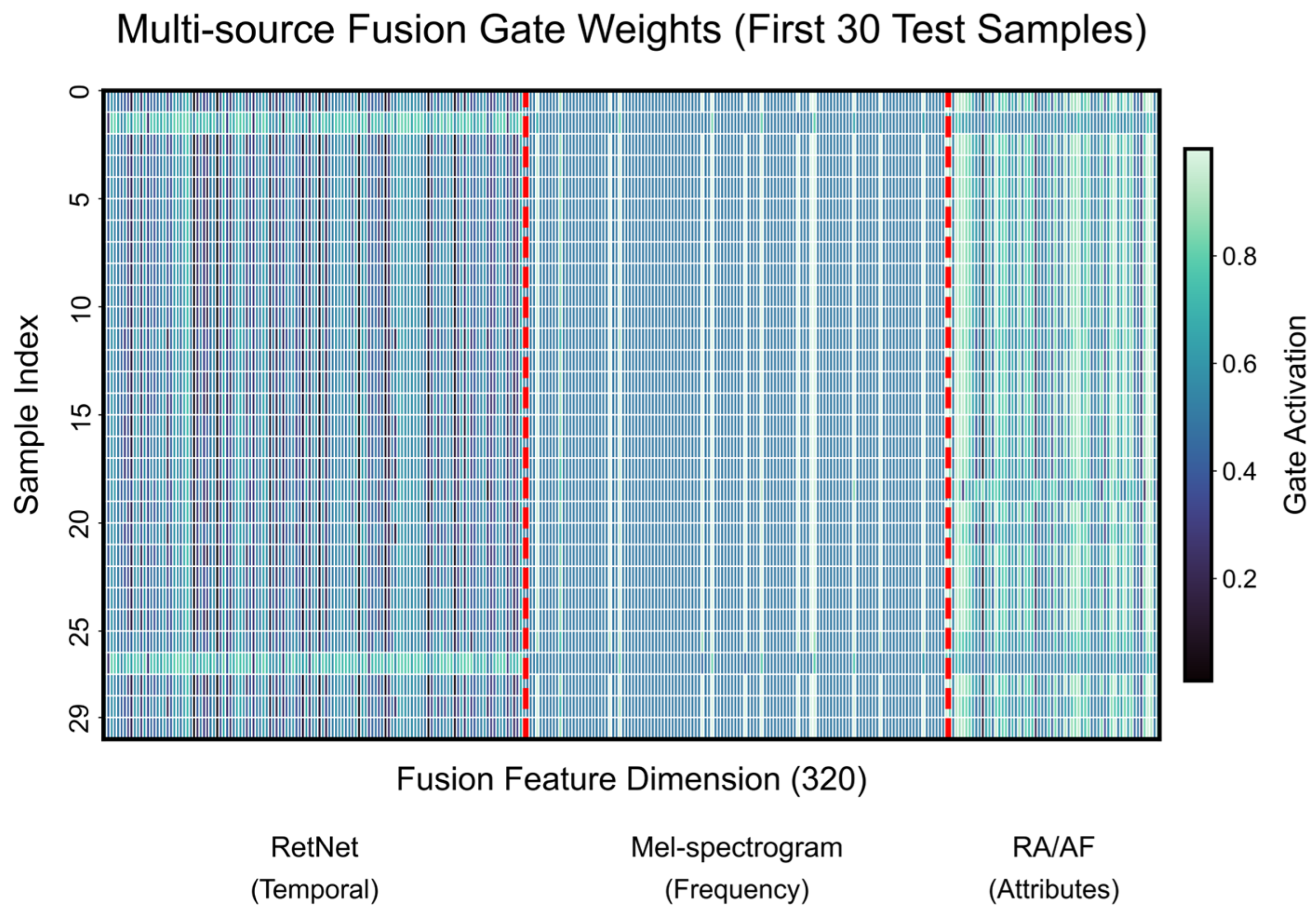 Figure 15 shows the learned multisource fusion gate weights for the first 30 test samples.