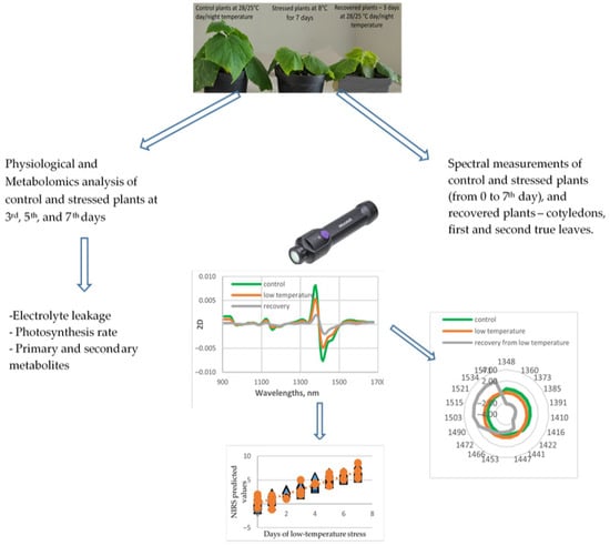 The main objective of this study was to evaluate the potential of near-infrared spectroscopy and the aquaphotomics approach for investigating low-temperature stress in cucumber plants by comparing results from changes in physiological parameters and metabolic content with those observed in spectral patterns.