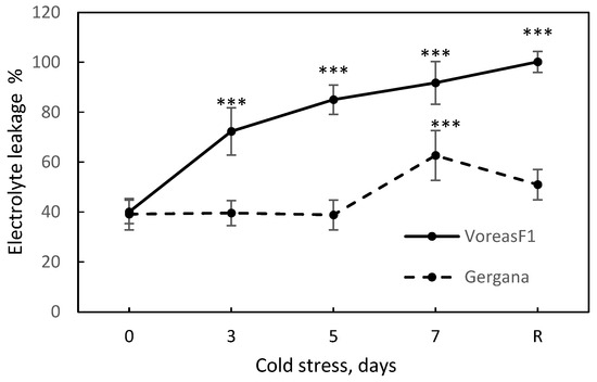 Electrolyte leakage during chilling stress and recovery of cucumber cv. Gergana and Voreas. Error bars represent the standard deviation. A t-test was applied to determine statistical differences between controls and the stress variants for each cultivar: *** p < 0.001.