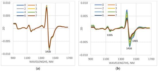 Average values of the spectral characteristics of first leaves of plants grown under low-temperature stress, transformed as a second derivative (2D), measured on different days (from 0 to 7th days of measurement). (a) cv. Gergana, first leaf; (b) cv. Voreas, first leaf.