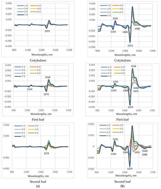 Differences between the spectral characteristics transformed as the second derivative of plants grown under low-temperature stress, measured on different days (days from 1st to 7th), and the spectra of the control (zero day). In figures, the legend 1-0 means spectra measured at day 1 minus spectra at day 0; 2-0 means spectra measured at day 2 minus spectra at day 0, etc. (a) Gergana cultivar; (b) Voreas cultivar.
