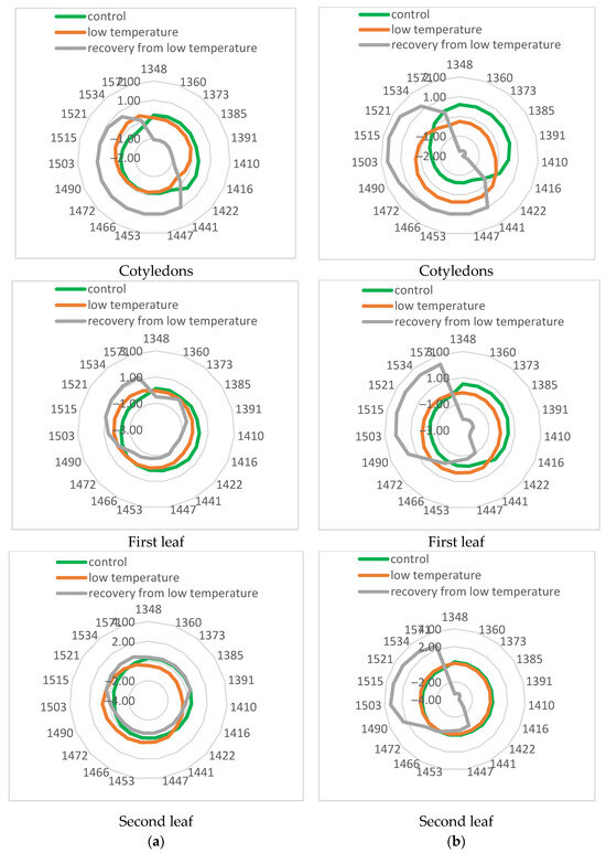 To further investigate the changes in leaves during low-temperature stress, aquagrams were calculated for control, stressed, and recovered plants (Figure 8). The aquagrams showed that the two investigated cucumber cultivars responded differently to the cold stress.