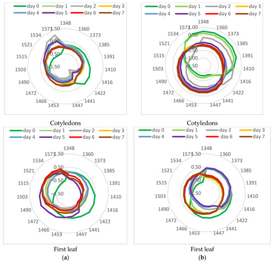 For a more detailed study of the changes in the spectral characteristics of the studied cucumber plants under low-temperature stress, the differences in the average spectra measured on day 0 and on days 1 to 7 of the LT stress were calculated (Figure 7). With the same scale of the coordinate axes for a particular leaf, it is clearly visible how much smaller the differences were in the plants of cv. Gergana compared to those for cv. Voreas, indicating greater low-temperature-induced changes in the plants of cv Voreas. When comparing the results for cotyledons, first leaf, and second leaf, differences were again observed. In plants of cv. Gergana, the differences between the spectra of control and stressed plants for cotyledons and the first leaf were approximately the same, and for the second leaf, they were smaller.