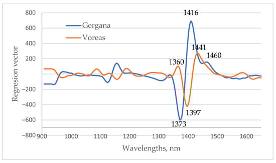 An illustration of the regression vectors from PLS regression models used to determine the days of low-temperature stress for the first leaf is presented in Figure 11. The most significant wavelengths were in the 1350–1470 nm regions, respectively. A similar finding was observed for models based on the spectra of cucumbers’ cotyledons and second leaves. The wavelengths with the biggest coefficient in the regression vector for the determination of days of low-temperature stress for cv. Gergana corresponds precisely to the wavelengths at which the greatest differences are observed in the spectra of plants under LT stress. Similarly to Gergana plants, the range of wavelengths in which the coefficients in the regression vector for Voreas were the biggest was in the area where differences in the spectral characteristics of plants measured on different days of stress were observed. The regression vectors confirmed the importance of the region of water absorption for low-temperature stress detection in cucumber plants. The significant wavelengths at 1360, 1373, 1416, and 1441 nm correspond exactly to some of the WAMAC.
