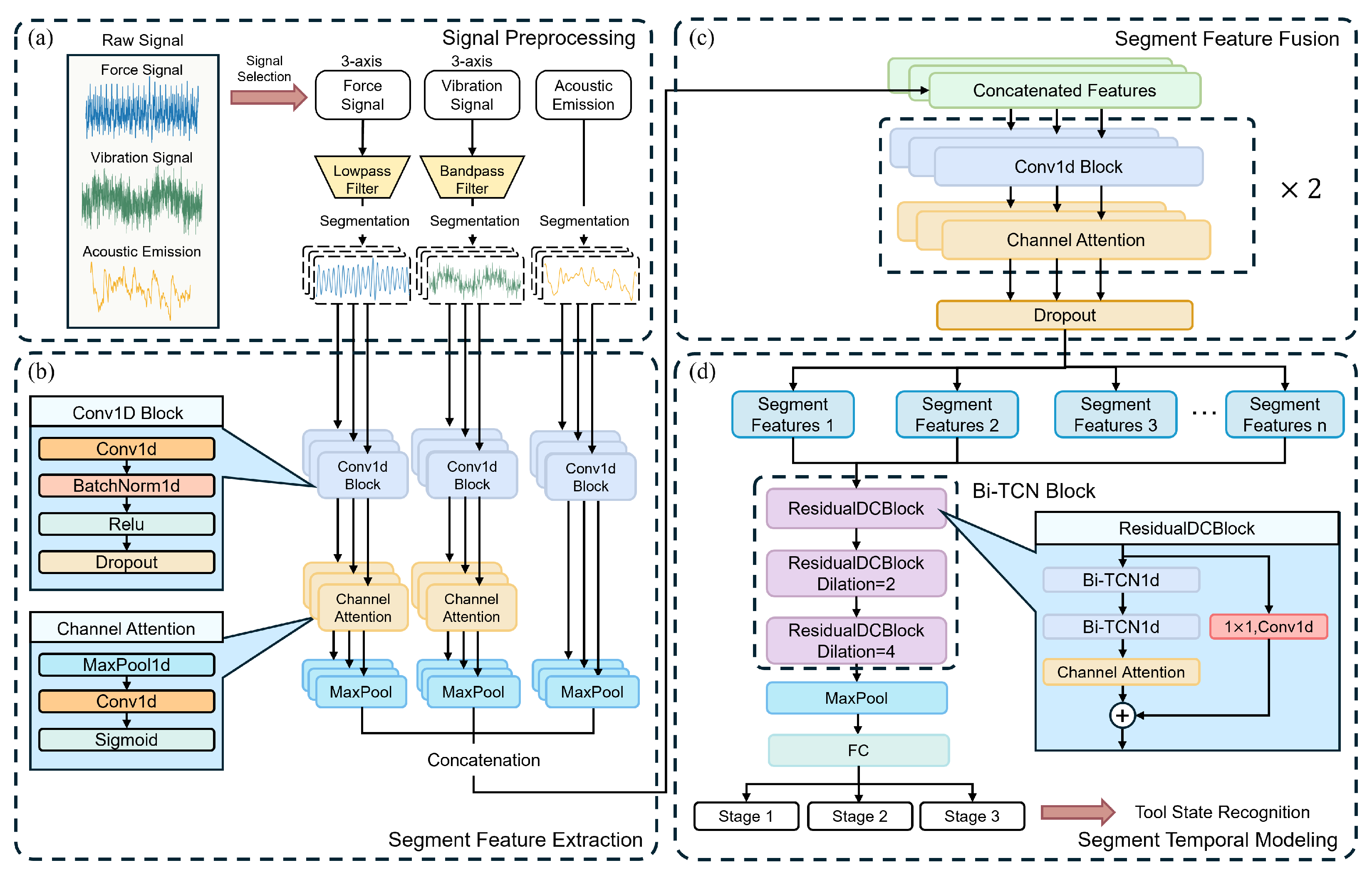 - The paper proposes a Hierarchical Multi-scale Temporal Network Hi-MDTCN, and designs a two-stage hierarchical processing strategy for intra-segment and inter-segment in the network. Intra-segment processing employs three-way parallel convolutions to process multi-source signals and introduces channel attention mechanisms to strengthen key features. Inter-segment processing adopts multi-scale dilated convolutional mechanisms to capture multi-scale patterns in the tool wear evolution process. The architecture achieves collaborative modeling of local features and global trends through the integration of time series slices.
