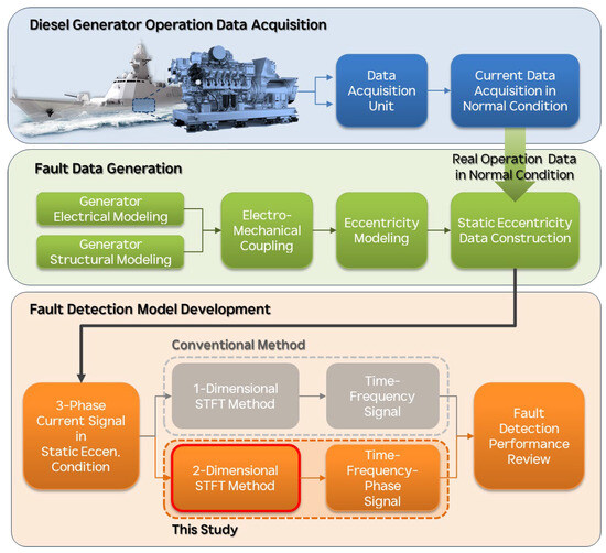 Figure 1 depicts the overall workflow of this study, which consists of three main stages: data acquisition, fault data generation, and fault detection model development. In the first stage (data acquisition), real operation current signals are captured from the vessel’s diesel-generator unit through a dedicated data-acquisition (DAQ) unit installed onboard. These long-term measurements under normal conditions provide the reference dataset, denoted as “Current Data Acquisition in Normal Condition.” In the second stage (fault data generation), the normal-condition signals serve as the baseline input for a physics-based simulation chain that integrates generator electrical modeling, structural modeling, and electro-mechanical coupling. Through this coupled framework, static eccentricity is imposed on the generator model to construct “Three-Phase Current Signals in Static Eccentricity Conditions,” enabling systematic synthesis of abnormal data across various eccentricity levels. In the final stage (fault-detection modeling), both the real operation data and the synthesized eccentricity data are analyzed to evaluate diagnostic performance. Conventional approaches typically employ a 1D-STFT to obtain time–frequency representations of each phase independently. In contrast, the present study introduces a two-dimensional short-time Fourier transform (2D-STFT) that constructs a time–frequency–phase representation by simultaneously considering the inter-phase relationships of the three-phase current signals. This formulation enhances the sensitivity to asymmetric fault patterns, allowing for more accurate and robust fault detection performance evaluation in the final review stage.