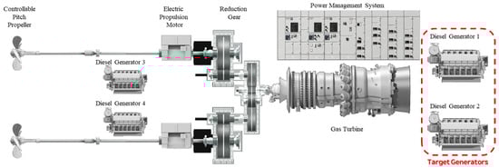 Figure 2 illustrates the overall propulsion system configuration of the vessel, which adopts a CODLOG (Combined Diesel-Electric or Gas) arrangement integrating diesel-electric propulsion and a gas-turbine drive. In this configuration, multiple diesel generators supply electric power to the propulsion motors and auxiliary systems during normal cruising and low-to-medium-speed operations, ensuring high efficiency and operational flexibility. At higher speeds, propulsion switches from the electric drive to a gas turbine that is mechanically coupled through a reduction gearbox, providing the necessary thrust for rapid acceleration and high-speed operation. This arrangement allows the propulsion system to selectively utilize either diesel-electric or gas-turbine modes, achieving both redundancy and fuel efficiency without the need for simultaneous operation.