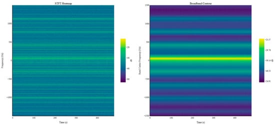 Figure 7 (left) shows the STFT spectrogram of the current signal measured from the target diesel generator under steady normal operating conditions. Because the generator was operating in a quasi-steady state without significant variations in load or operating conditions, the resulting time–frequency distribution remains stable over time, exhibiting no abrupt changes in spectral characteristics. The right panel of Figure 7 presents the broadband energy contour obtained by dividing the frequency axis into 30 Hz intervals and computing the power spectral density within each band. This representation allows for clear identification of the frequency regions where the signal energy is concentrated. The dominant energy appears at 60 Hz, corresponding to the rotational frequency of the generator, with additional prominent components at the 7th harmonic (420 Hz) and the 13th harmonic (780 Hz). Such harmonic patterns are commonly determined by key alternator design parameters—such as the number of stator slots, winding configuration, and coil span—and the pronounced energy concentrations observed at the 7th and 13th harmonics are attributed to the inherent electromagnetic characteristics of the alternator installed on the target diesel generator.
