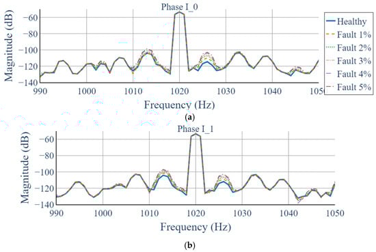 The bottom panel of Figure 8 illustrates the frequency characteristics of the final static-eccentricity fault–simulated data, obtained by superimposing the fault-induced spectral variations onto the healthy measurement. As shown, most harmonic components exhibit minimal change before and after fault injection, whereas the 1020 Hz component demonstrates a pronounced increase, consistent with the model-predicted fault effect. In this study, static eccentricity levels from 1% to 5% were applied to generate multiple fault-simulation cases, which were subsequently used for validating the proposed fault-detection model. It is noted that the synthesized fault data used in this study represent model-derived approximations of static eccentricity rather than real fault measurements. This hybrid approach enables systematic control of fault severity at very low eccentricity levels but does not substitute field measurements from actual eccentricity events. Accordingly, the selected eccentricity range of 1–5% represents a practically relevant and literature-supported regime for assessing early-stage detection performance [10,11].