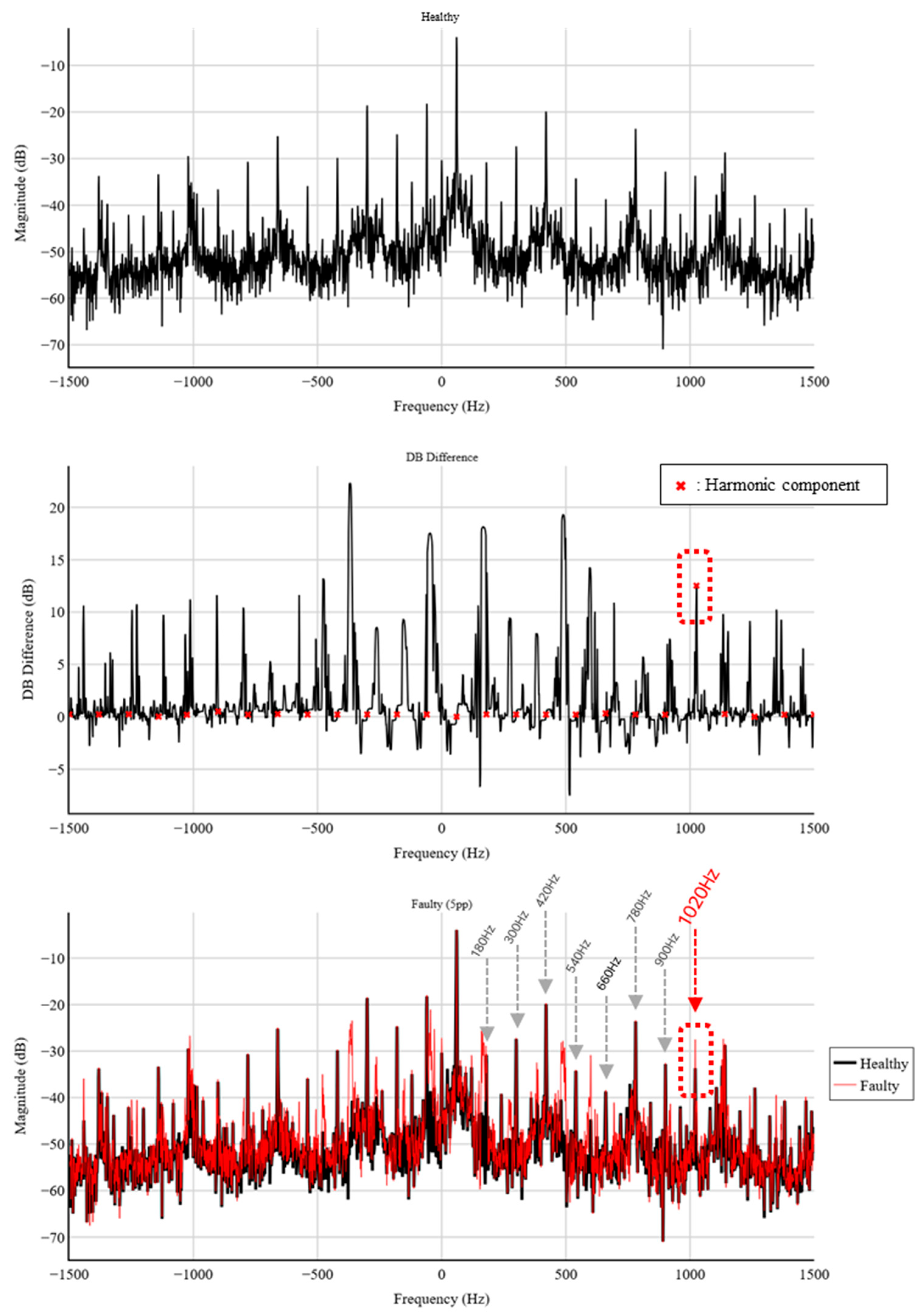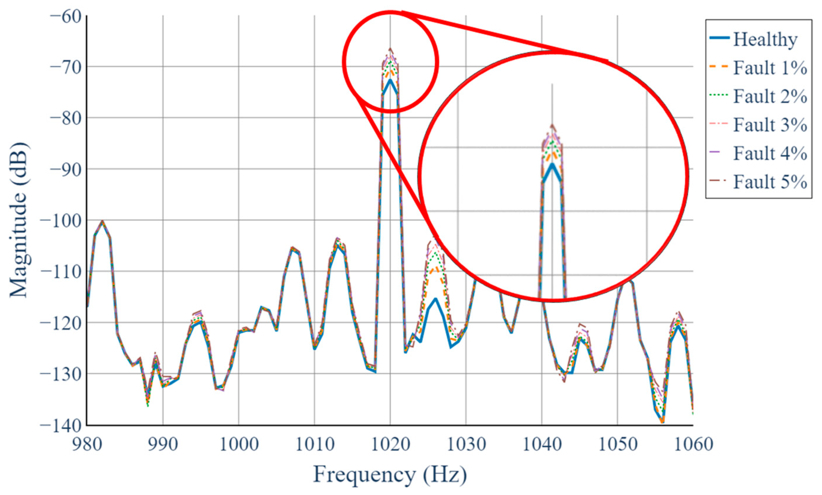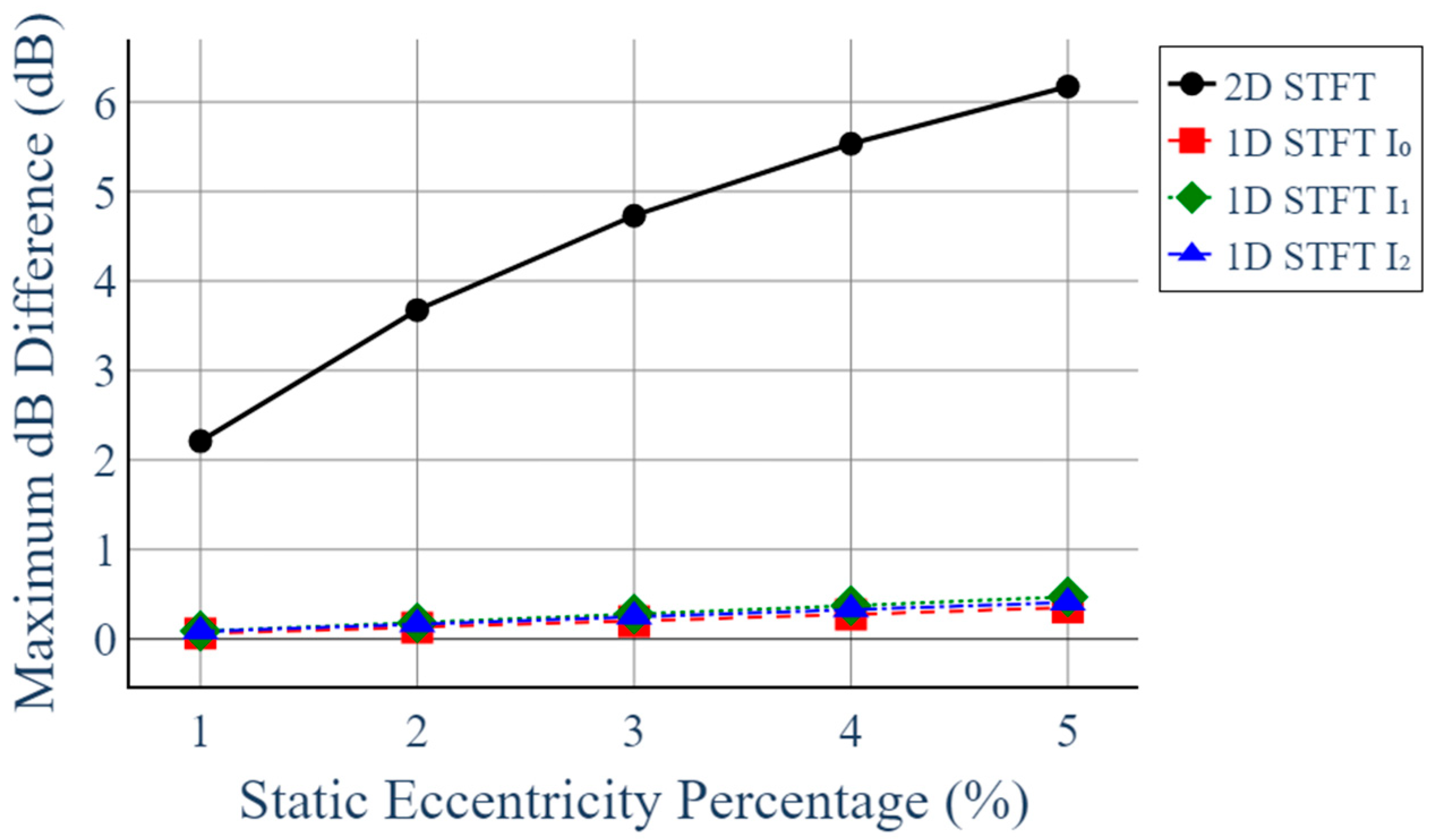 - We show that, for the target generator, the 2D STFT yields a distinct harmonic component at 1020 Hz (17th harmonic of the 60 Hz supply), whose magnitude increases monotonically from 0% to 5% static eccentricity. In contrast, conventional 1D STFT analysis of each phase exhibits negligible variation under the same conditions.