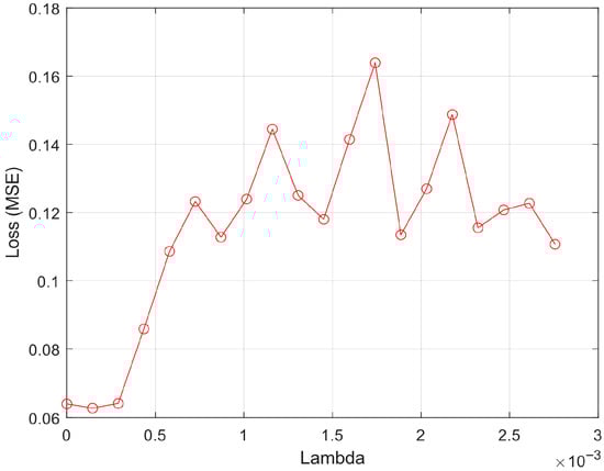 Figure 2 illustrates the effect of the regularization parameter (λ) on model performance during the RNCA process. The x-axis denotes the range of λ values tested, while the y-axis shows the corresponding mean squared error (MSE) on the validation set. Each point represents the loss value obtained from a specific λ, used to assess the model’s generalization capacity. The tuning curve exhibits a clear minimum at λ = 0.000145, where the model achieves its lowest validation loss (MSE = 0.0627). This point represents the optimal trade-off between model complexity and performance, indicating that the selected subset of features at this λ offers the best generalization without overfitting. The gradual rise in MSE on either side of this optimal point suggests that both under-regularization (λ too small) and over-regularization (λ too large) degrade model performance.