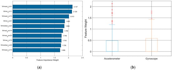 Meanwhile, Figure 3a presents a horizontal bar chart showing the top 10 features ranked by importance weights as determined by RNCA. Each bar represents a feature’s contribution to the classification model, where a higher weight signifies greater relevance in minimizing classification error. Notably, the top three features, Wmean_accX1, Wmin_accY1, and Wmean_accY3 carry weights exceeding 2.0, clearly dominating the distribution. This indicates a strong preference for acceleration-based features, particularly along the X and Y axes, which correspond to forward-backward and side-to-side linear movements, respectively.