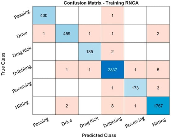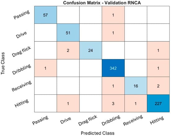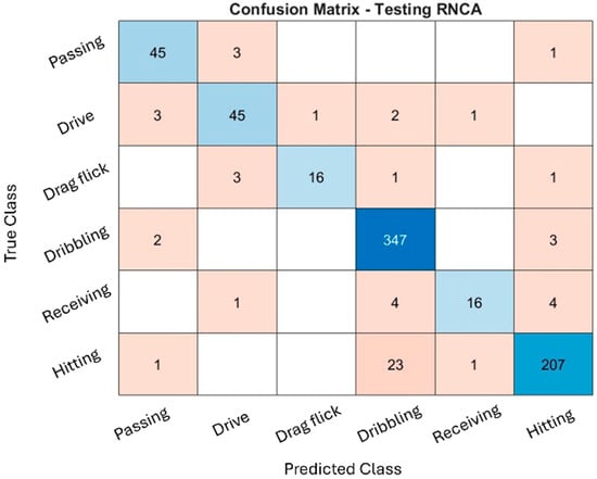 The RNCA configuration exhibits strong accuracy for actions with clear biomechanical characteristics, such as dribbling and hitting, reflecting the success of the two-stage feature selection approach. However, recognition performance for drag flick and receiving is comparatively weaker, underscoring the limitations of using only static features for temporally nuanced or motion-overlapping activities. This confusion matrix analysis highlights both the strengths and limitations of the current approach and provides guidance for future refinement in sensor-based activity recognition classification.