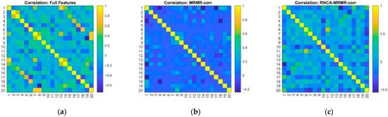 The heatmap corroborates this improvement by exhibiting a more diffuse and sparse structure, consistent with the primary objectives of the MRMR filtering approach which maximizing the relevance of retained features while minimizing redundancy. Subsequently, the RNCA configuration, as illustrated in Figure 7c, further refines the correlation structure. While RNCA does not specifically target the reduction in feature correlation, the synergistic combination of supervised feature weighting and prior MRMR filtering has led to a feature set that is even more decorrelated. The remaining features present varying degrees of correlation, predominantly showing minimal to moderate correlations, as indicated by the darker cells in the correlation matrix.