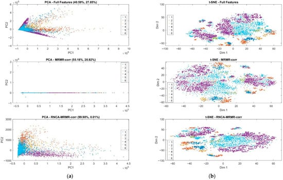 The visual results of dimensionality reduction achieved through PCA and t-SNE across three distinct feature configurations. In the original features configuration, PCA yielded a triangular dispersion pattern in the PC1–PC2 space, where the two principal components account for 40.59% and 27.85% of the total variance, respectively, as depicted in Figure 8. This moderate coverage of variance advocates the presence of substantial redundancy and noise within the original set of 432 features. The extensive spread and notable overlap observed among different activity clusters imply that linear separability is limited, thereby complicating the differentiation between distinct activity classes based solely on these principal components. Moreover, this conclusion is reinforced by the findings from the t-SNE visualization, which displayed only loosely defined clusters characterized by considerable overlap, as illustrated in Figure 8b. The scattered distribution evident in the t-SNE plot indicates the existence of nonlinear relationships among the features; however, these relationships remain inadequately captured by the high-dimensional representation of the Original Features configuration. Consequently, the visual outcomes from both PCA and t-SNE underscore the necessity for more refined feature selection techniques to enhance the representation of class structures in the analyzed data.