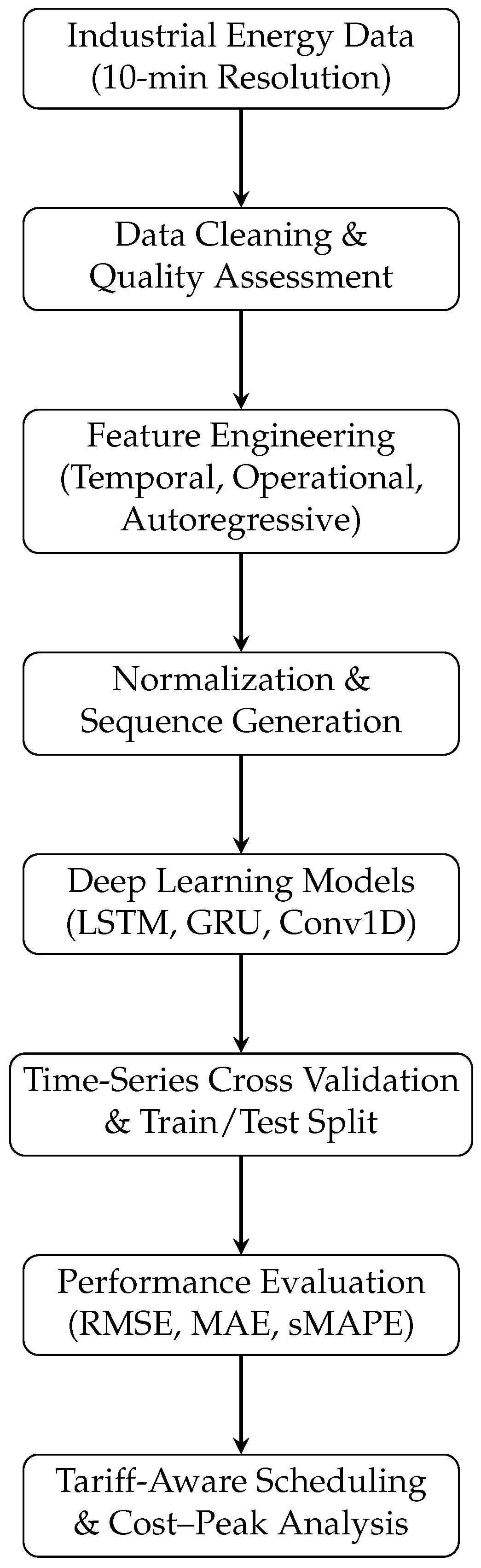 Figure 3 summarizes the complete methodological workflow adopted in this study, from raw data acquisition and preprocessing to deep learning-based forecasting, validation, and tariff-aware scheduling analysis.