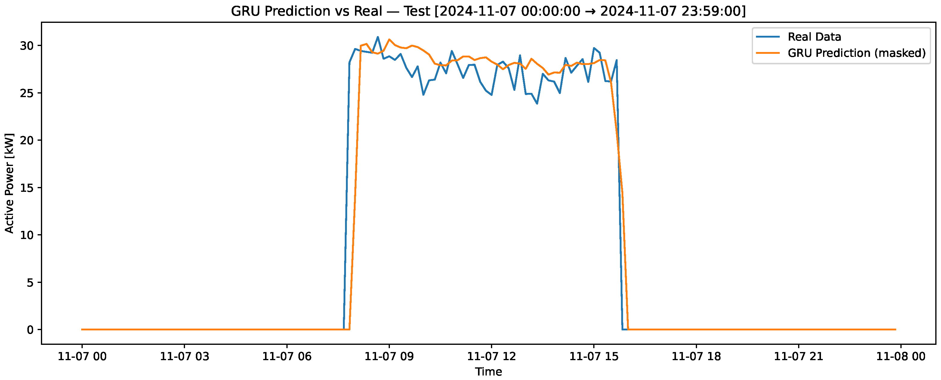 Table 2 correspond exclusively to single-layer GRU models evaluated during the hyperparameter tuning stage. Although the lowest RMSE (1.709 kW) was obtained with 150 units using ReLU and Adam (ID 9), this tuning phase was only intended to identify suitable activation and optimization trends. The final forecasting architecture adopted for all subsequent experiments is the two-layer GRU model with 64 and 32 units described in