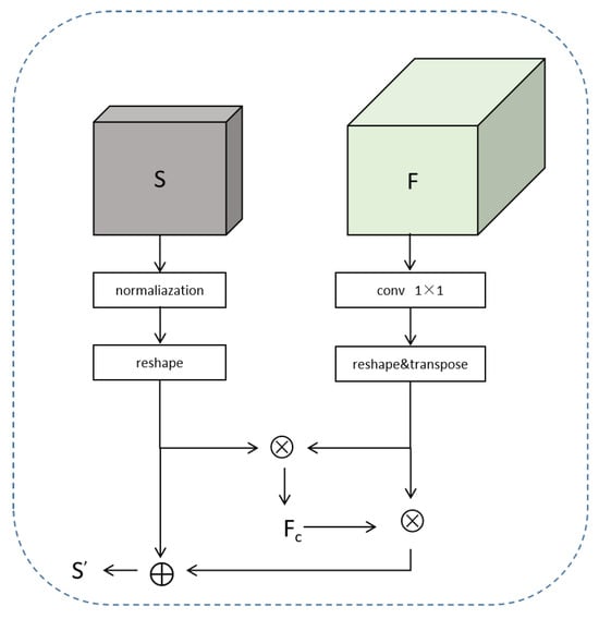 Secondly, to reduce computational costs, the feature map F is dimensionally reduced using a 1 × 1 convolution, reducing the number of channels to . Simultaneously, F and are reshaped into and , where , H denotes height, and W denotes width. The pre-segmentation results S serve as the similarity between pixels and classes. Matrix multiplication is then performed on the transposes of F and , followed by normalization, yielding the global class center features . The calculation formula is as follows:
