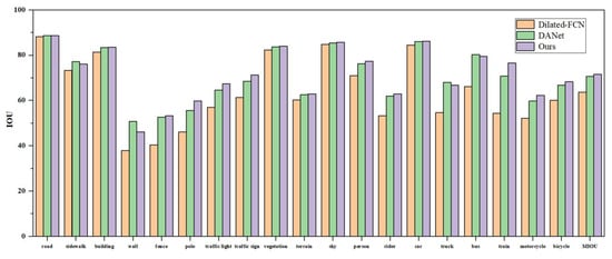 Figure 6 presents a comparison of segmentation results across various categories for the baseline network, DANet, and the proposed algorithm.