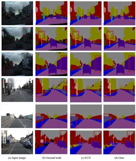 Figure 9 presents a comparison of the visual segmentation results between the baseline model and the proposed algorithm. It is evident that the proposed method improves segmentation accuracy and boundary regularity for small objects such as traffic signs and lamp posts. Compared to FCN, our approach incorporates a superpixel sampling weighting module to capture fine-grained local features while enhancing the network’s sensitivity to target boundaries, leading to smoother and more precise edge delineation. For larger objects like buildings and sidewalks, the improved algorithm leverages class-center modeling to incorporate rich contextual information, which significantly enhances feature discriminability, promotes spatial continuity in segmentation, and reduces instances of misclassification.