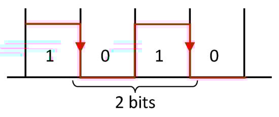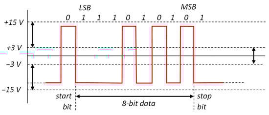 RS-232 has one digital signal for each asynchronous receiving and transmitting direction, both referenced to ground. The digital signal is bipolar, commonly between +10 V and −10 V, and, according to the specification, within a limit of ±25 V and a transition threshold of ±3 V. Figure 2 shows an example of a transmitted signal corresponding to the “W” ASCII char (8 bits with binary code 01010111), with no parity bit and one bit of stop. The logic 1 (called mark) is represented as a negative voltage, whereas the logic 0 (called space) is signaled by a positive voltage.