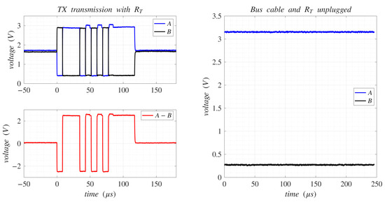 Differential signal output from the CAN transceiver sharing lines with the RS-485 transceiver, including PUL, TISP, and PTC protections. (Left) Transmission of the same data packet as in Figure 7. (Right) When the bus cable with the is unplugged.