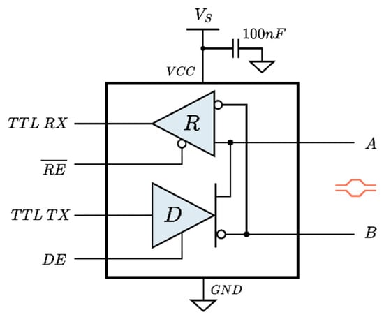 RS-485 transceivers use two tri-state buffers to enable half-duplex communication (Figure 4). Each buffer can be enabled or disabled using external control lines called DE (Drive Enable) for transmission and RE (Receiver Enable) for reception. These digital control lines are managed by the user protocol layer according to the arbitration algorithm that defines when a node is allowed to transmit or receive data. The general usage is to keep the transceiver in receive mode (: low, : low) and only switch to transmit mode (: high, : high) when data needs to be sent. The capability to fully disable the transceiver (: low, : high) is especially useful for saving power but also for keeping the bus free when it is shared with other transceivers, as required in this work.