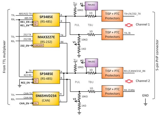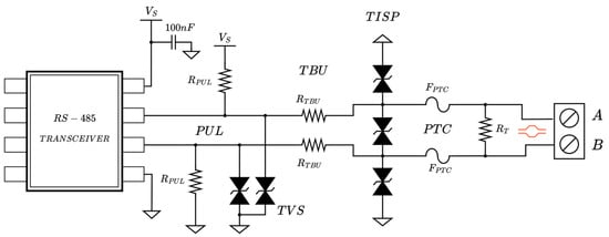 The organization and setup of the described protections are shown in Figure 5. This circuit is shared by signal pair-based transceivers in the multi-serial bus interface system presented: RS-485, RS-422, and CAN. To support full-duplex RS-485 communication, the circuit must be duplicated.