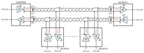 The RS-422 is an interface standard very similar to the RS-485, with the main improvement being the use of two independent balanced differential voltage channels to provide full-duplex communication (TX+/TX− and RX+/RX−). This interface, also known as TIA/EIA-422 and reaffirmed by the Telecommunications Industry Association in 2005 [25], supports various network topologies such as unidirectional, point-to-point, or multi-drop, but no more than one master is allowed in the same network. In contrast to RS-485, the transceiver does not require communication control lines (RE/DE), as both tri-state buffers are always active, with one dedicated to transmission and the other to reception. Figure 6 shows the typical arrangement of an RS-422 network with multiple slaves. It is important to note that each of the two channels, transmit and receive, must be properly terminated at both ends with a termination resistor (), and that surge protection should be applied to both, as recommended in RS-485.