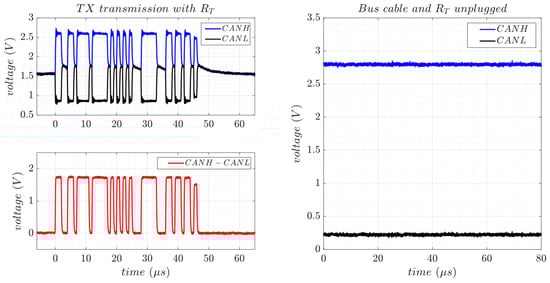 The ISO 11898-2 standard [26] defines the physical layer for various versions of the CAN bus, with particular emphasis on the CAN 2.0A protocol, commonly referred to as high-speed CAN. This version supports data transfer rates of up to 1 Mbps. According to the standard, any nominal differential voltage below 0.5 V between CANH and CANL is interpreted as a recessive state, while a differential voltage above 1.5 V is interpreted as dominant. The dominant voltage must be between 1.5 and 3 V, usually around 2 V. Furthermore, the standard does not specify a fixed ground reference; instead, it defines the common voltage of the two signals to float anywhere within the range of −2 V to 7 V.