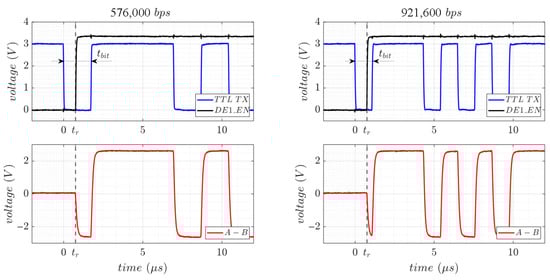 The RS-485 standard specifies the bipolar A-B signal with a transition threshold of ±0.2 V and low and high voltage limits of −7 V and +12 V, respectively. Logic 0 is represented by a negative differential voltage, whereas logic 1 is represented by a positive one. Like RS-232, RS-485 typically transmits asynchronous ASCII data frames under the Universal Asynchronous Receiver-Transmitter (UART) peripheral. Figure 3(left) shows the A and B signals referenced to ground, along with the resulting A-B differential signal when transmitting an 8-bit “W” ASCII character at 115,200 bps, with no parity and one stop bit, using the 3.3 V low-power SP3485EN-L [23] transceiver from MaxLinear (Carlsbad, CA, USA). In this configuration, signal A reaches up to 3 V and signal B drops to 0.5 V for a logic 1, and the opposite for a logic 0. The resulting A-B differential voltage is +2.5 V for logic 1 and −2.5 V for logic 0, remaining within the specified limits and transition threshold defined by the standard.
