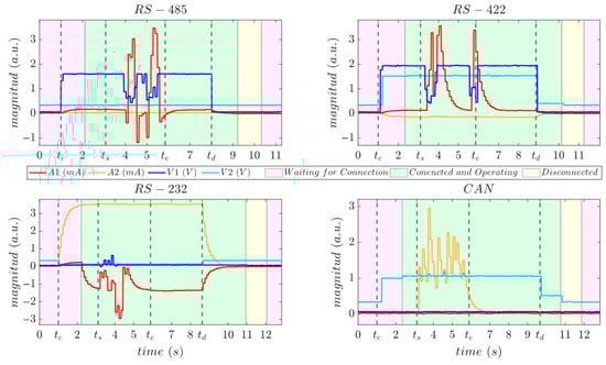 Table 1 presents the average current consumption measured on the differential lines for the RS-485 and CAN interfaces using a standard digital multimeter (AM-555-EUR from BEHA-AMPROBE GmbH, Glottertal, Germany). Measurements were performed under three conditions: (i) with the cable and unplugged, (ii) connected to the bus with (point-to-point with another transceiver), and (iii) during raw data transmission. The measured current increased substantially when the bus cable with was connected; however, the current values remained almost identical for both RS-485 and CAN, consistent with the voltage behavior. Consequently, independent differential signaling is required for these interfaces to automatically determine the connection type when using current and voltage line sensing.