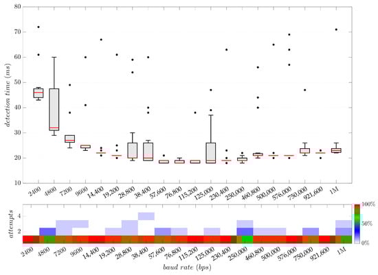Box plot of the baud rate detection time using the algorithm presented in Figure 15 across 15 trials for each of the supported speeds during a raw random data transmission (top). Distribution of 20-sample block validation attempts required for successful detection (bottom).