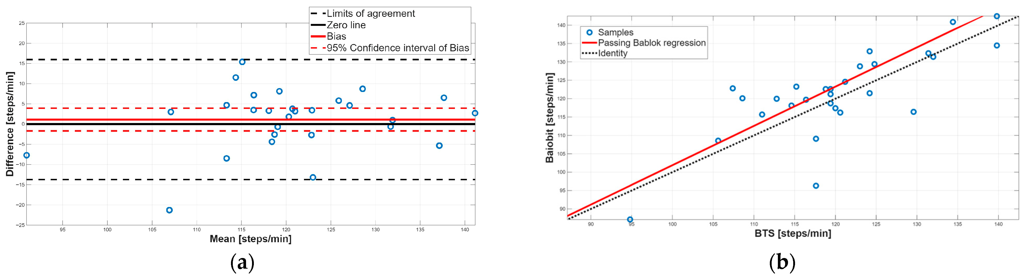 | Cadence [steps/min] | 1.07 | 0.78 to 1.44 | −5.01 | −50.50 to 28.52 | 1.11 | −1.69 to 3.92 | −13.73 to 15.96 |
