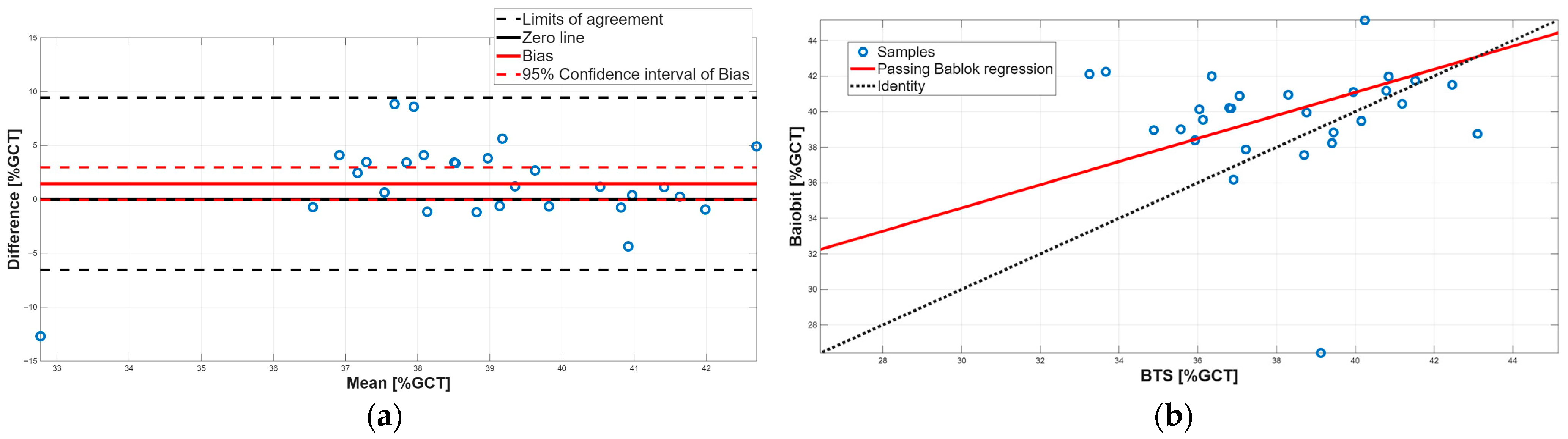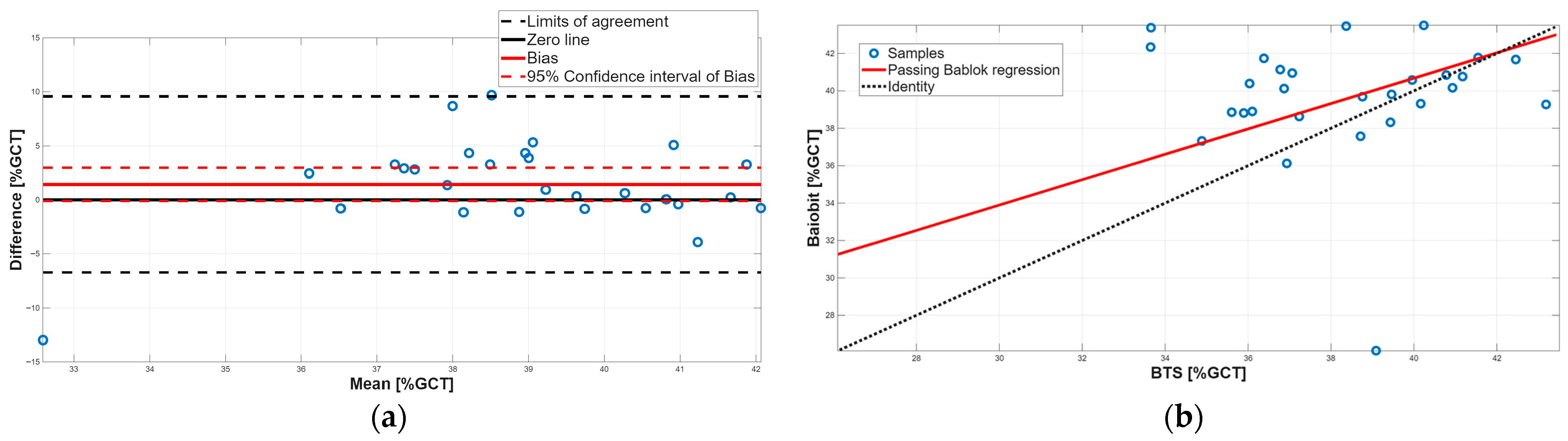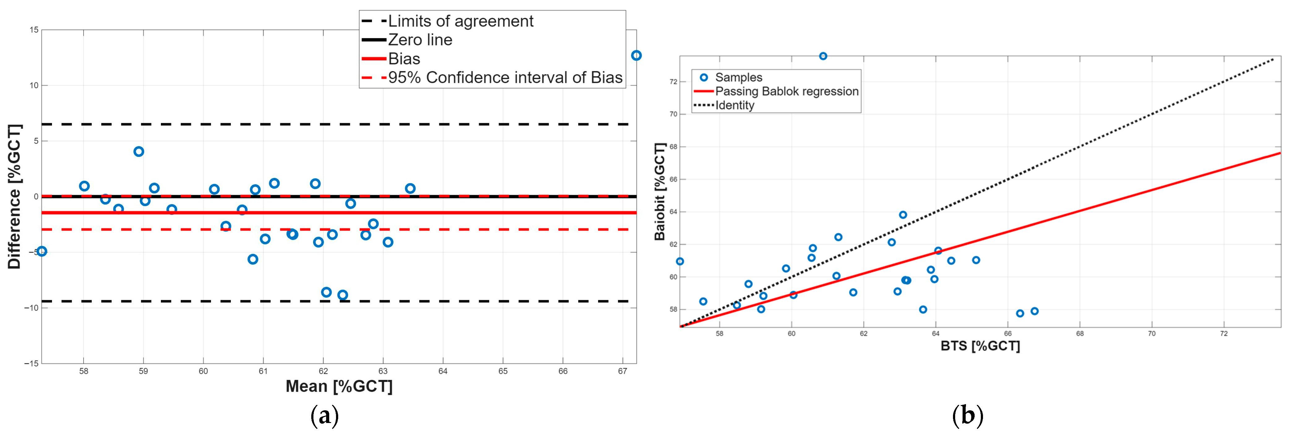 - Passing, H.; Bablok, W. A new biometrical procedure for testing the equality of measurements from two different analytical methods. Application of linear regression procedures for method comparison studies in clinical chemistry. Part, I. Clin. Chem. Lab. Med. 1983, 21, 709–720. [Google Scholar] [CrossRef]