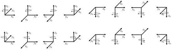 To accurately model these deviations, these installation errors are expressed in vector form in this study. The normal vectors of the sensitive axes of the three accelerometers and the three HRGs, represented in the hexahedron coordinate system, are shown in Equation (2).