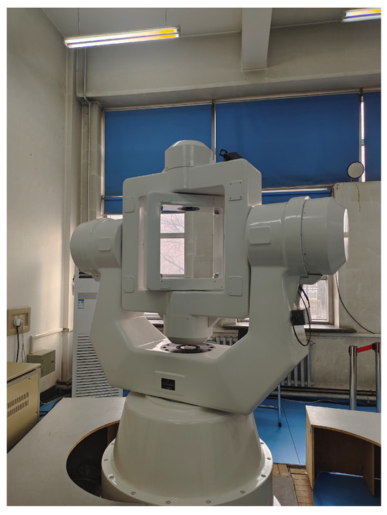 To verify the correctness of the method proposed in this paper, a validation experiment was designed on a three-axis turntable. The turntable used in the validation experiment was mounted on a vibration-isolated foundation to suppress interference, and the ambient temperature during the experiment was maintained at 20 °C. The three-axis turntable is shown in Figure 5, the HRG SINS is shown in Figure 6. To rigorously validate the accuracy of the proposed method, a semi-physical simulation experiment was conducted using a high-precision three-axis turntable. The HRG’s measurement accuracy in SINS is higher than 0.01°/h, the accelerometer’s measurement accuracy is higher than 10−4 g. The three-axis turntable serves as the attitude reference standard. Its key technical specifications are Positioning Accuracy: 5″, Positioning Repeatability: 1″, and Rate Stability: Better than 0.001%.