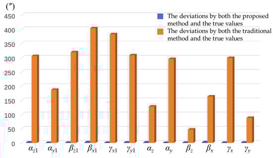 The deviations between the installation errors identified by both the traditional method and the proposed method and the true values.