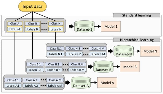 Hierarchical learning pipeline is developed. Hierarchical learning is a different machine learning strategy that breaks down complex input data into a hierarchy of simpler datasets [34]. This strategy has proven to achieve better results in domains where input data is diverse [35], or when the problem can be divided into concrete sub-tasks [36]. In this work we apply this strategy by breaking down the dataset that was generated by the standard learning method into smaller N datasets. Each dataset is essentially a subset of the dataset-1 and contains its own classes M and labels M. As a result, instead of training 1 DL model, the hierarchical learning approach trains N models, using N different datasets.