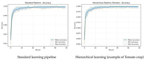 Before turning to test behavior, we note that both pipelines train perfectly on the clean data: optimization is stable, validation accuracy increases smoothly, and no signs of divergence or overfitting are observable in the curves. This apparent success is precisely why we evaluate on augmented inputs; the augmented test set reveals how much of the in-distribution performance carries over under realistic degradations and highlights where the two designs differ once conditions deviate from training. On the augmented test set two effects are clear. First, crops with similar symptoms show lower global accuracy in the per-class table, indicating that the single-head model mixes cross-crop patterns under degradations. Second, the hierarchical pipeline raises accuracy within most crops, consistent with specialization when decisions are confined to a single crop; this appears as higher per-crop values in Table 2. Training–validation curves typically look smoother for the standard learning due to maximal pooling of heterogeneous data, whereas the hierarchical pipeline converges quickly but to crop-dependent plateaus that reflect varying difficulty under augmentation. Notably, these experiments were performed using both FedAvg and FedProx. However, the outputs were almost identical.