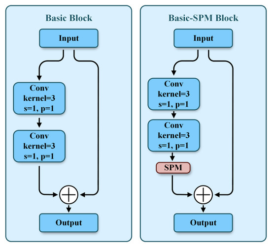 First, we select Deep Layer Aggregation 34 (DLA34) as the feature extraction network for 4× downsampling. Classic deep networks such as ResNet and EfficientNet mainly focus on optimizing the deep propagation process of feature extraction, and usually require additional structures like a Feature Pyramid Network and Path Aggregation Network to achieve feature fusion across different levels. In contrast, DLA34 inherently incorporates an iterative aggregation mechanism for multi-level feature information. This characteristic enables it to combine feature extraction and fusion within a unified framework, achieving higher accuracy with fewer parameters. By integrating semantic fusion and spatial fusion, it further enhances the ability to recognize objects and their locations. The foundational component of DLA34 is the Basic block. Considering the limited receptive field of traditional convolutions and their weak ability to capture long-range dependencies, common practices involve using dilated convolutions, global pooling, and pyramid pooling to expand the receptive field and capture global information. However, these methods are not sufficiently effective for slender signal objects. The SPM [32] has been better applied in semantic segmentation. It utilizes horizontal and vertical strip pooling operations to collect long-range context from different spatial dimensions and achieves input feature refinement by encoding location information. Distinct from conventional square pooling, strip pooling averages the feature values across each row or column, thereby circumventing the inclusion of noise from regions that are not associated with the slender signal objects. Thus, we propose to build the Basic–SPM block by integrating the SPM into the Basic block (see Figure 3). By reweighting the input, the SPM enhances the Basic block’s local perception and global understanding of the input feature in both horizontal and vertical directions.