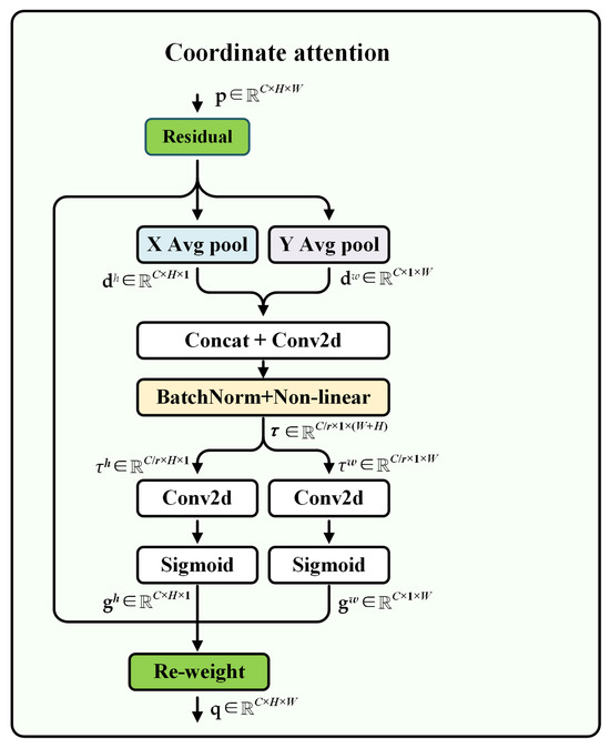 Therefore, during the feature fusion and upsampling stages, we combine the CA mechanism with deformable convolution to enhance the network’s extraction of spatial features at different scales. By focusing on critical spatial information across scales, the CA improves the model’s multi-scale perception capability, leading to more precise object localization and recognition. This module is highly lightweight and achieves significant performance improvements with minimal computational overhead. Specifically, CA performs average pooling operations on the input in the horizontal and vertical directions, respectively, aggregating them into two direction-aware feature maps. Then, by concatenating these two feature maps and conducting convolutional operating, attention weights corresponding to the respective directions are generated. The attention weights are fused with the original input features through weighted combination, thereby enhancing the feature representation of the regions of interest. The computational process of the CA module is shown in Figure 5. Given the tensor , like the SPM, we first use horizontal and vertical strip pooling to get and . They enable CA to capture long-range dependencies and help networks locate objects more accurately.
