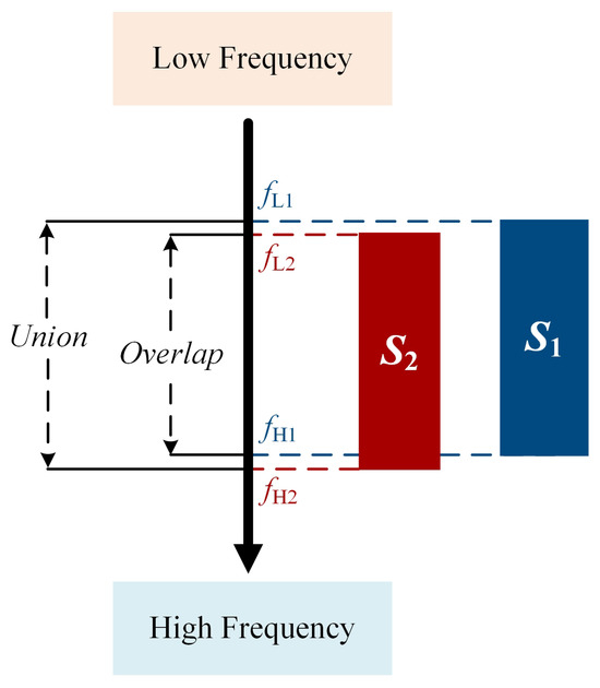 Therefore, we propose a post-processing algorithm called the TFCO to alleviate the above problem. Typically, we sort the prediction boxes based on confidence and use the top K prediction boxes as the output of the model. Let be the prediction box of object , where denotes low frequency and denotes high frequency . In order to measure the similarity of K prediction boxes in center frequency and bandwidth, Interval-IoU is designed for evaluation. Inspired by the Intersection over Union (IoU) design in object detection, we present Interval-IoU, used to assess the proximity of signal frequency ranges. Interval-IoU is shown in Figure 8. Taking signals and as examples, with frequency ranges and , the Interval-IoU formula is defined as follows: