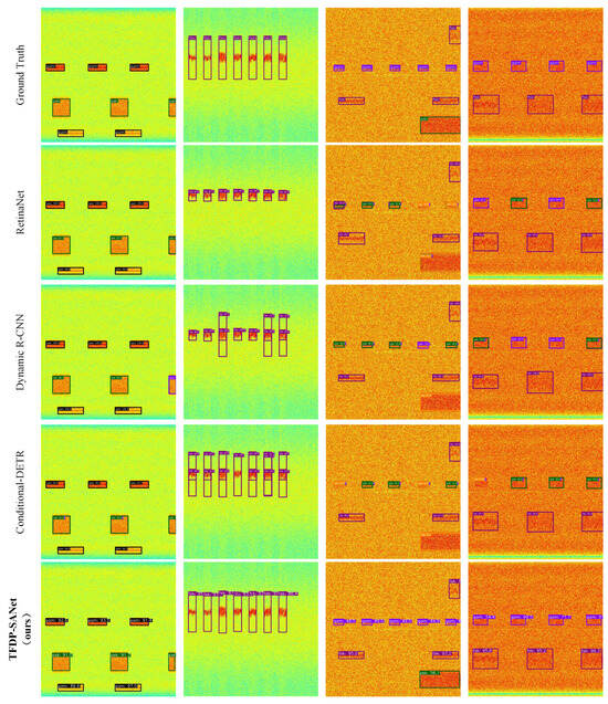 To demonstrate the effectiveness of the TFDP-SANet method, we select several advanced object detection models as benchmarks for comprehensive comparative experiments. Specifically, the evaluation results of all models on the WBSig53 dataset are shown in Table 6. Throughout both the training and inference processes, we maintain a consistent input size of 512 × 512 time–frequency images for all networks. Moreover, we also present the baseline experiment results provided by the TorchSig team, which are marked with an asterisk (*) in Table 6. Experimental results demonstrate that the proposed method exhibits superior performance across the majority of metrics. In the comparative experiment, YOLOv3 demonstrates the fastest detection speed and also performs well in terms of mAP. Conditional-DETR achieves the best results in small-object detection and ranks second overall.