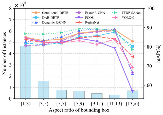 To verify the unique advantages of TFDP-SANet in target structure perception, we statistically analyzed the mAP performance of various models for targets across different aspect ratio intervals, with specific results shown in Figure 10. As can be seen from the figure, the distribution of target aspect ratios exhibits significant differences, covering a full range of scenarios from compact forms (aspect ratio ) to extremely elongated forms (aspect ratio ). The comparison results indicate that TFDP-SANet demonstrates stable performance advantages across all aspect ratio intervals: in the case of medium-form targets with aspect ratios ranging from 1 to 11, its mAP almost surpasses that of all other models; in the case of extremely elongated targets with aspect ratios , its mAP value is only lower than that of transformer-based models. Overall, these results fully confirm the strong adaptability of TFDP-SANet to changes in target structures.