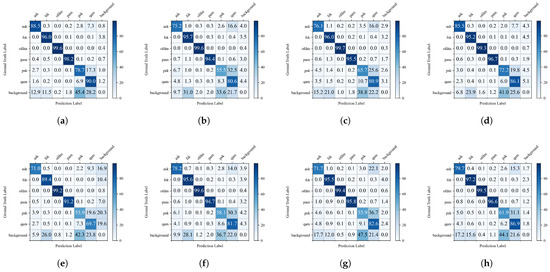 Confusion matrices of different models: (a) TFDP-SANet, (b) Faster R-CNN, (c) RetinaNet, (d) YOLOv3, (e) FCOS, (f) Dynamic R-CNN, (g) DAB-DETR, (h) Conditional-DETR.