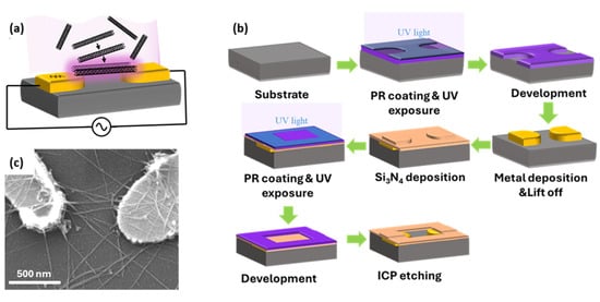 - Jinkins, K.R.; Chan, J.; Jacobberger, R.M.; Berson, A.; Arnold, M.S. Fabrication of carbon nanotube field-effect transistors in commercial silicon manufacturing facilities. Nat. Electron. 2020, 3, 492–501. [Google Scholar] [CrossRef]
