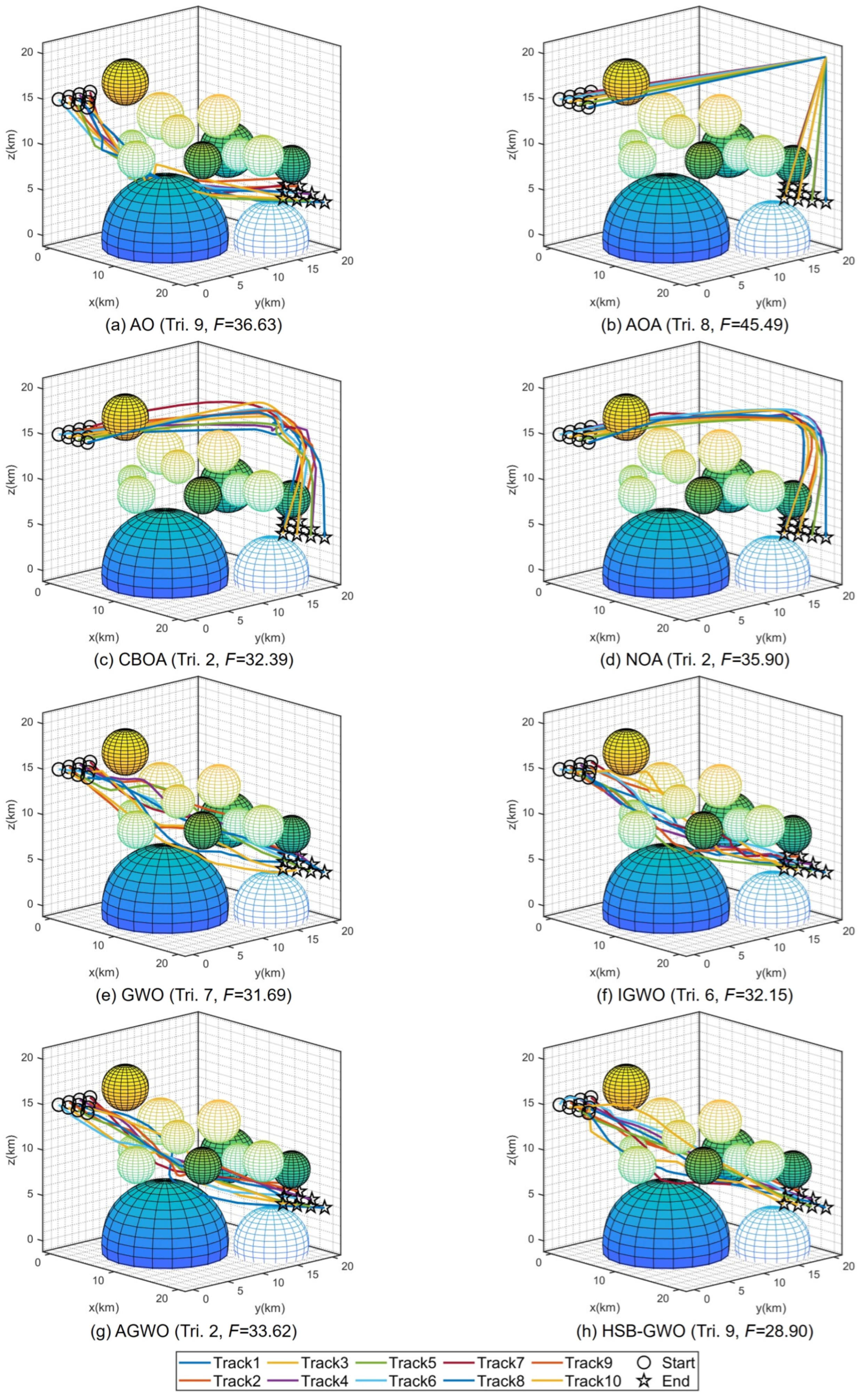 Considering that threat areas with spherical shapes are common in real environments, the aforementioned threat models are constructed. It is worth noting that threat modeling and HSB-GWO are independent, which means that different modeling methods will not affect the path planning algorithm. Therefore, different models and penalty functions can be designed according to actual needs.