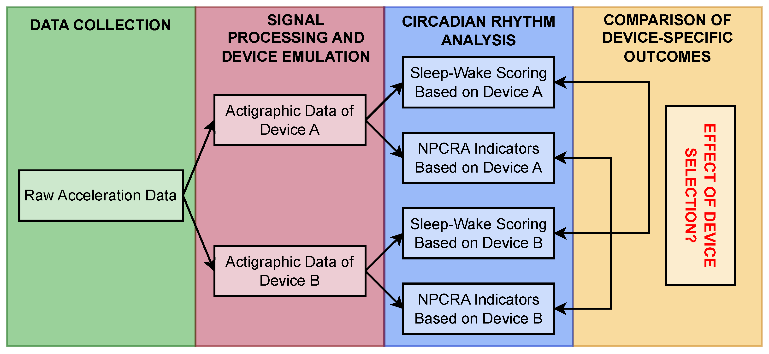However, considering our previous comparative work [2], in which we underscored the discrepancies between activity determination methods, the question arises as to how strongly the results of NPCRA and sleep–wake scoring depend on manufacturer-specific approaches to locomotor activity quantification and, pragmatically speaking, on device selection. In the context of NPCRA, this question has not yet been systematically examined, even though studies frequently employ devices from different manufacturers—e.g., Ametris LLC (Pensacola, FL, USA, formerly ActiGraph LLC) [13,14,15], CamNtech Ltd. (Cambridge, UK) [16,17], Condor Instruments (São Paulo, Brazil) [18,19,20,21], Ambulatory Monitoring Inc. (Ardsley, NY, USA) [21,22,23,24,25]—and thus analyze activity signals produced by heterogeneous processing pipelines (see Section 2.2.2 for details), directly compromising cross-study comparability. For sleep–wake scoring, only one work has evaluated how results obtained with the Sadeh algorithm vary with the consumer wearable used to record raw acceleration; however, the raw data were compressed to epoch-level form in only a single way using the Actilife software product developed by Ametris, leaving the broader landscape of device-specific effects unmapped [26].