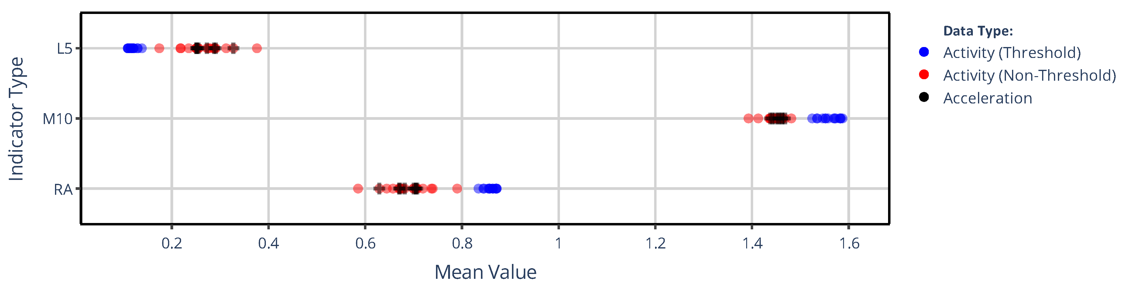 Figure 3 illustrates how the mean values of L5, M10, and RA across 42 subjects depend on which signal-processing pipeline in our generalized framework was used to determine the acceleration or activity signal. For each NPCRA indicator, 43 mean values are represented with colored dots: 35 for those activity signals that previously formed the rows and columns in the correlation matrix of Figure 2, and 8 for acceleration signals that have undergone various preprocessing procedures. The coloring of the dots in Figure 3 indicates three categories: blue denotes values computed from epoch-level activity data derived with threshold-based metrics (TAT and ZCM), red denotes values from activity data derived with non-threshold metrics, and black denotes values computed directly from higher-temporal-resolution acceleration data preprocessed in different ways. As shown, applying the L5 indicator to threshold-based activity signals (blue) yields systematically lower values than applying it to activity signals derived with any non-threshold metric (red). By contrast, for M10, the pattern reverses: threshold-based metrics yield higher values. Notably, the indicator values computed from acceleration signals (black) closely resemble those computed from activity signals obtained with non-threshold metrics (red). Since RA is derived from L5 and M10 values, it also forms two distinct clusters, similar to those observed for the two aforementioned indicators.